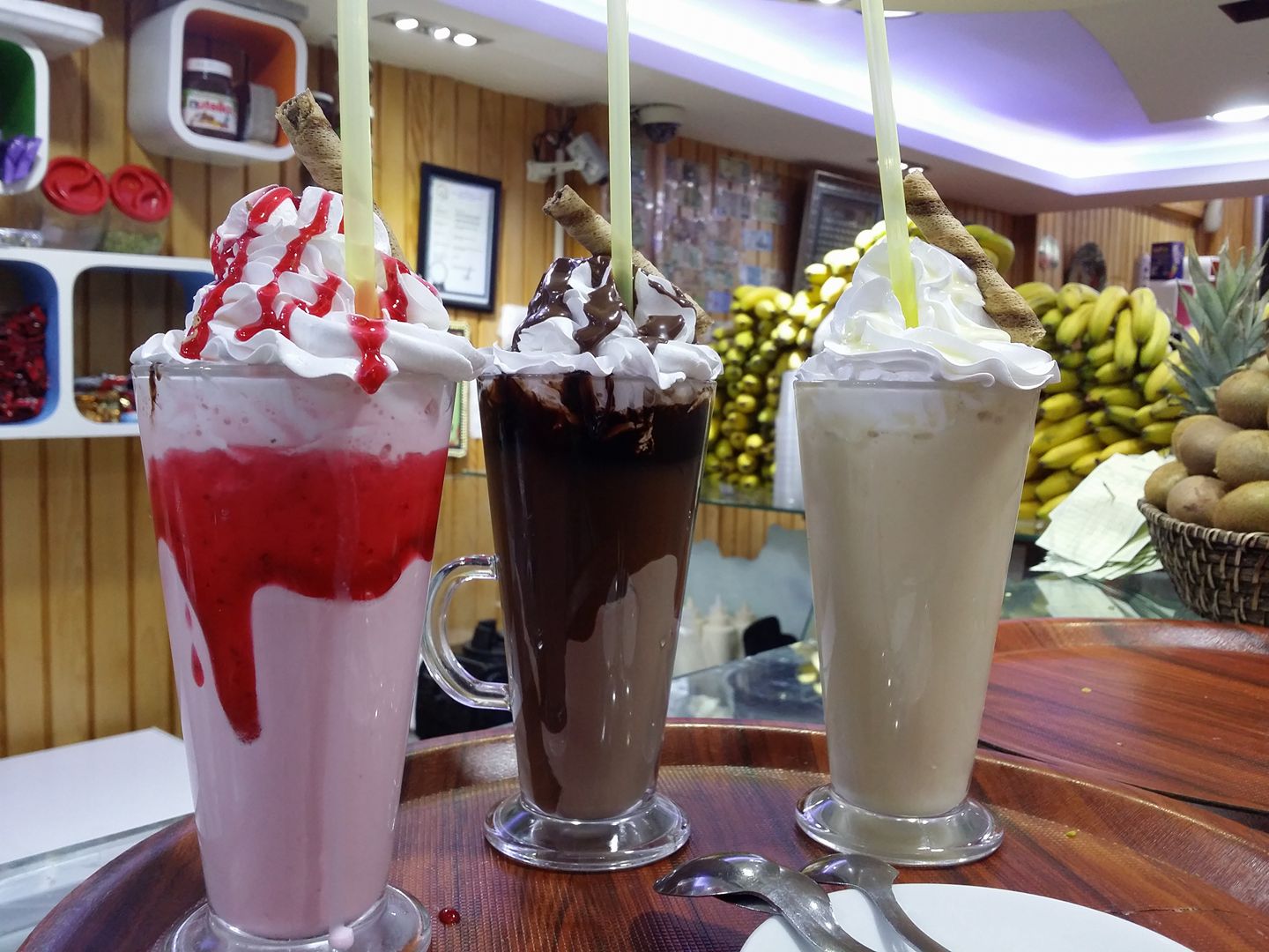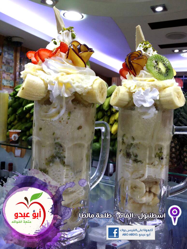 يكون مؤلف من الحليب والقشطة والنسلة ونضيف بعض الفواكه وهو مشروب بارد ونوعه حسب الطلب